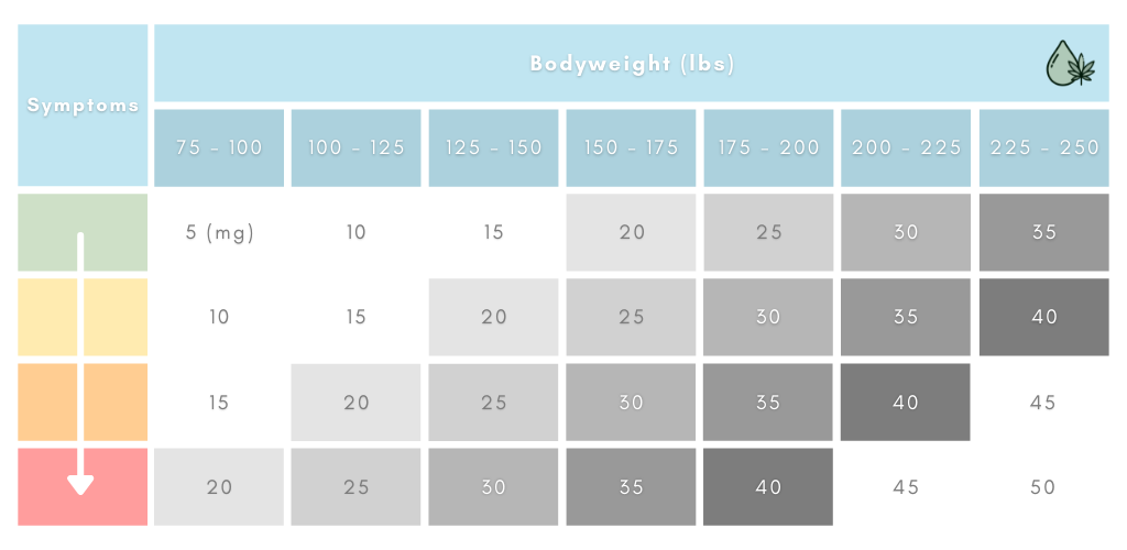 Here’s a simple CBD dosage chart that combines user body weight with condition severity. While the perfect dosage requires knowing more about individual factors, this is a good starting point for your CBD journey: